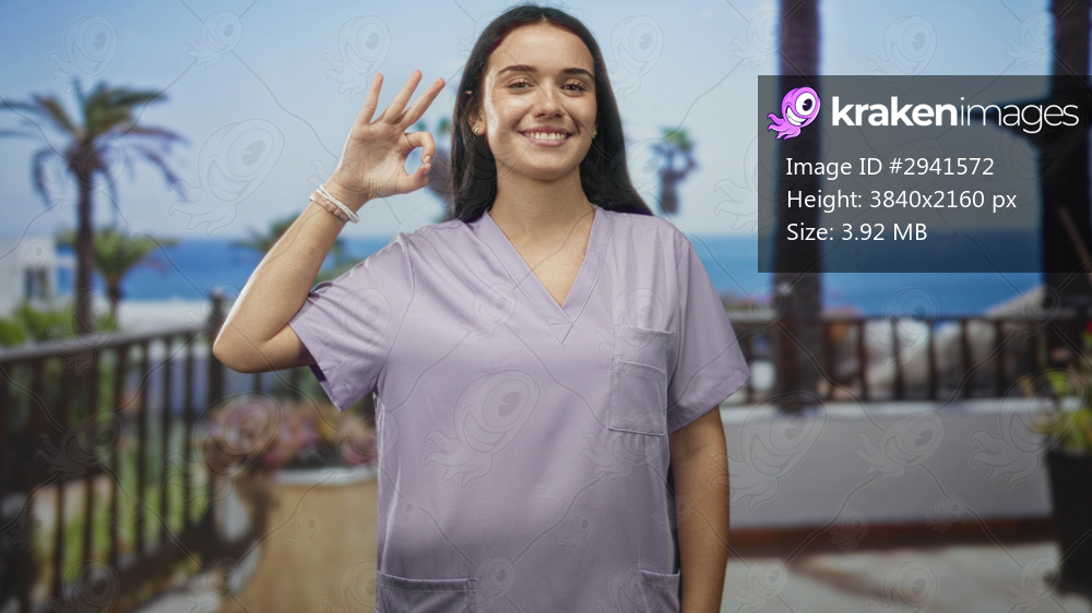 Woman nurse making ok sign with right hand while smiling on a seaside balcony in building; reassurance care.