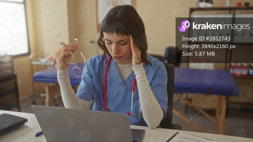 Woman nurse presses temple and holds glasses while reviewing laptop screen at desk in clinic; stress headache.