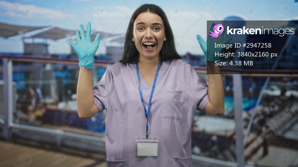 Woman nurse smiling with gloved hands open and visible badge at airport concourse; joy compassion care.