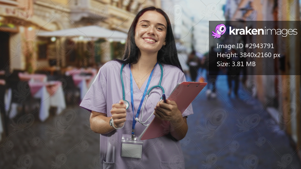 Woman nurse smiling and holding stethoscope and clipboard with hands in a street cafe; compassionate care.