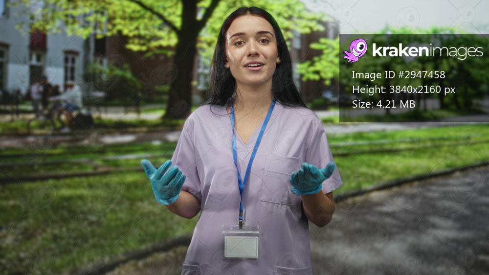 Woman nurse speaking with open gloved hands and visible id badge in hospital building; reassurance support.
