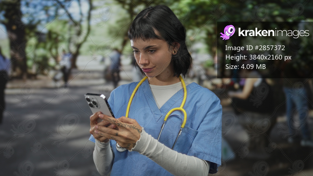Woman nurse with stethoscope and smartphone gives thumbs up gesture on a green forest path; approval.