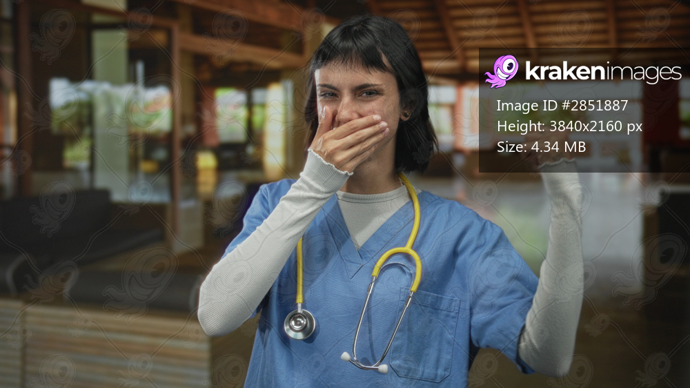 Woman nurse wearing blue scrubs with stethoscope points thumb to side in building; confidence encouragement.