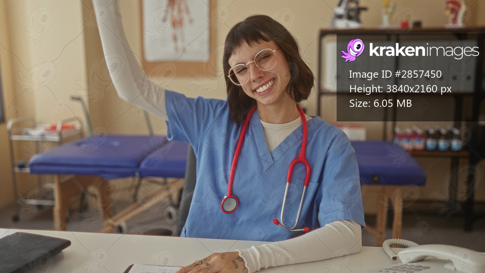Woman nurse wearing blue scrubs and stethoscope raises arm in building; confidence empowerment success.