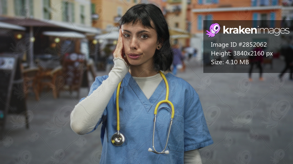 Woman nurse wearing blue scrubs and stethoscope touches forehead with hand on an urban street; stress.