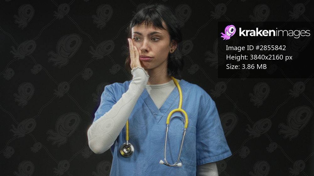 Woman nurse wearing blue scrubs and yellow stethoscope with hand to forehead in studio against black backdrop; fatigue.