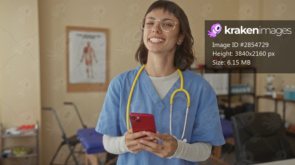 Woman nurse wearing glasses and blue scrubs with stethoscope holding smartphone in building; care focus.