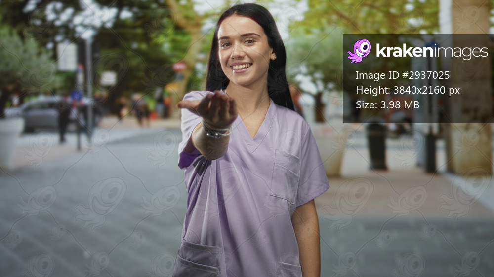 Woman nurse wearing lilac scrubs extends right hand in an offering gesture on street, smiling and approachable; compassion welcome.