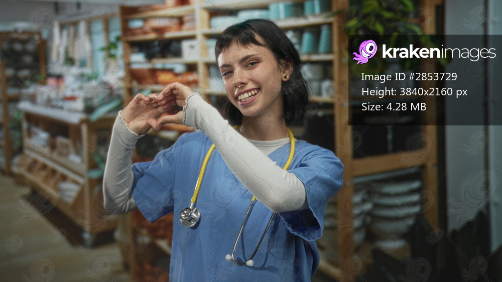 Woman nurse wearing scrubs makes a heart shape with her hands in a building decor store; compassion.