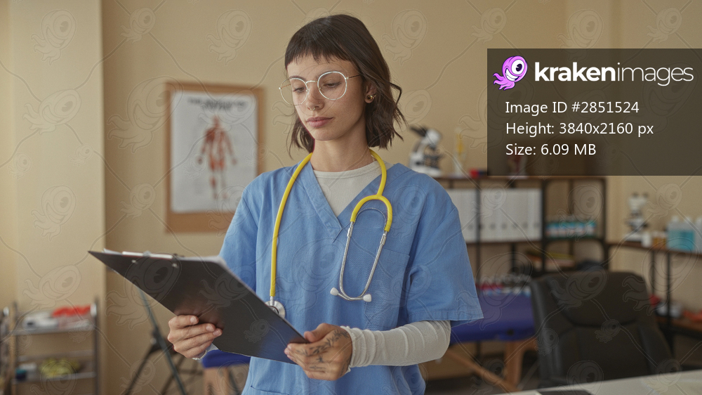 Woman nurse wearing stethoscope holds clipboard in a clinic building and gazes at medical records; compassion.
