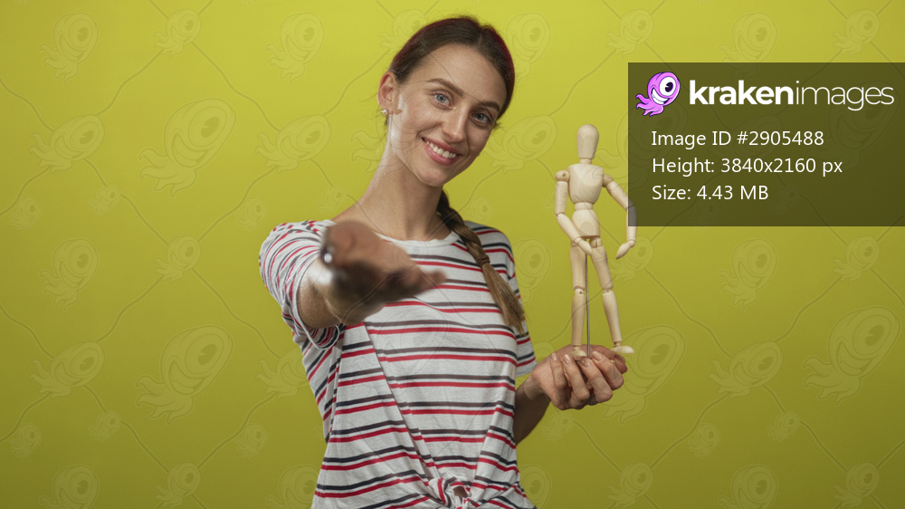 Woman offering a wooden artist mannequin with outstretched hand in studio with lime green backdrop; friendly invitation.