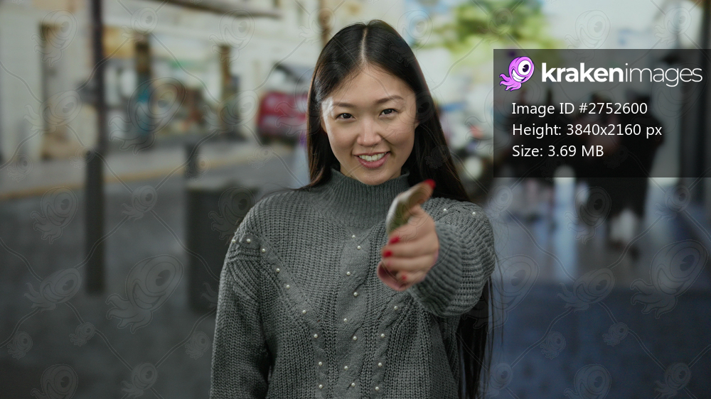 Woman offering handshake on urban street in city setting, showcasing friendly asian female in outdoor environment illustrating connectivity and engagement with blurred background. - Kraken Images