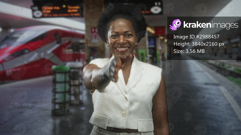 Woman offering handshake with outstretched hand on a train platform inside a building; welcoming trust connection.
