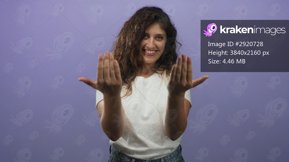 Woman offering open palms toward camera in purple studio wearing white t shirt, smiling with visible hands; welcoming invitation.
