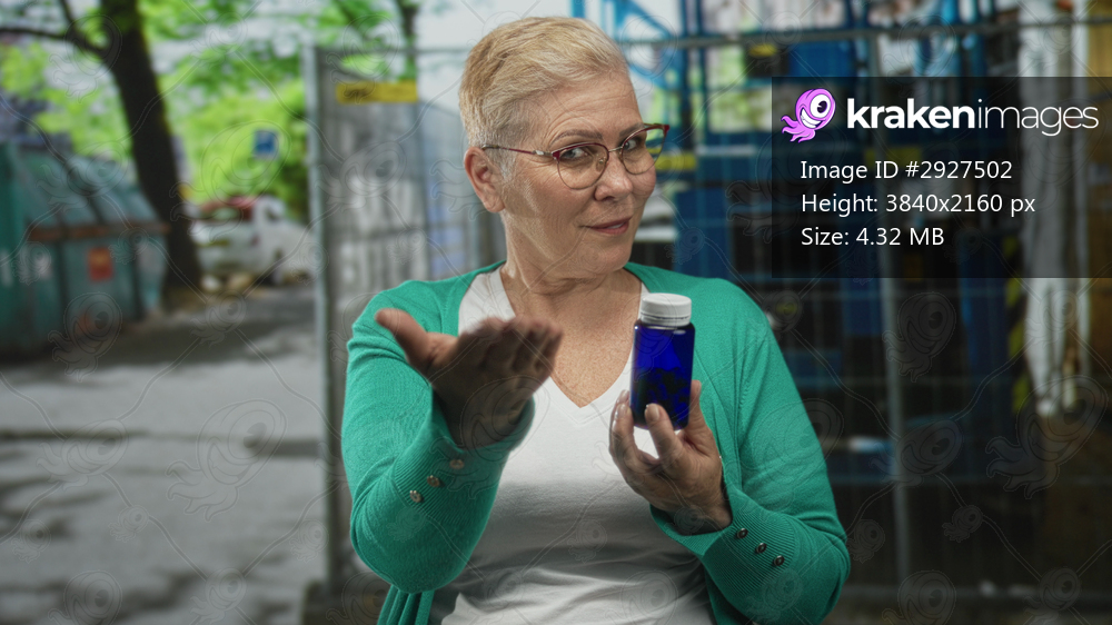 Woman offers a blue pill bottle with open hand on a street, smiling and gesturing to the container; compassion health support aid.