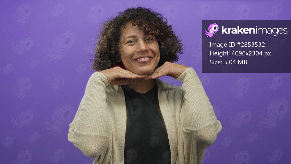 Woman offers a two finger peace sign with her hand against a vivid purple studio backdrop while smiling broadly; joy.