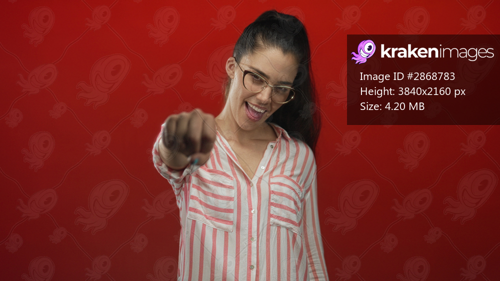 Woman offers fist bump with visible fist in red studio wearing glasses and striped shirt; friendship camaraderie.