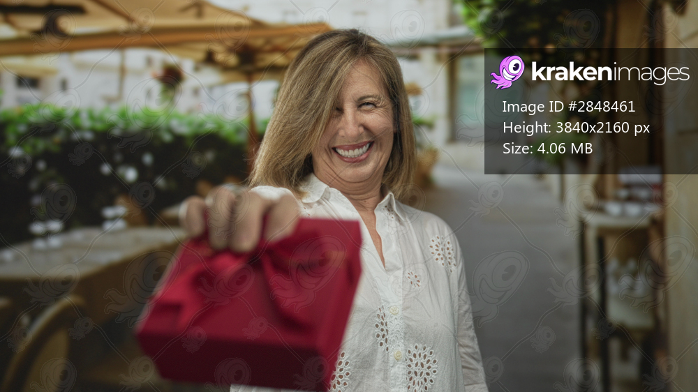Woman offers red gift box with outstretched arm on sunlit building terrace; celebration generosity joy surprise.