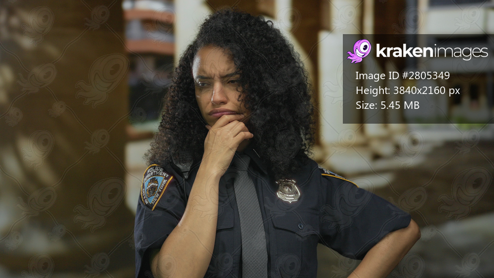 Woman officer in uniform pensive on an old town street, showcasing a thoughtful expression amidst urban surroundings.