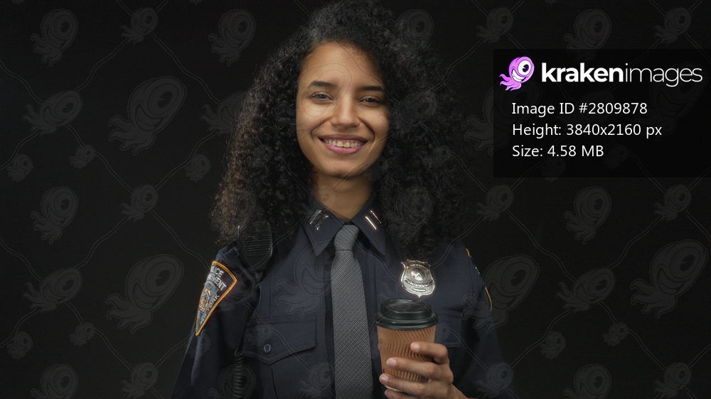 Woman officer smiling in police uniform holding coffee against black background suggesting professionalism and friendliness.