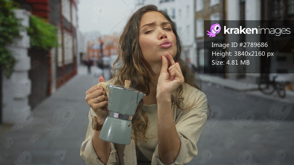 Woman on a city street holds pastel blue coffee maker and pinches fingers to show tiny size; precision.