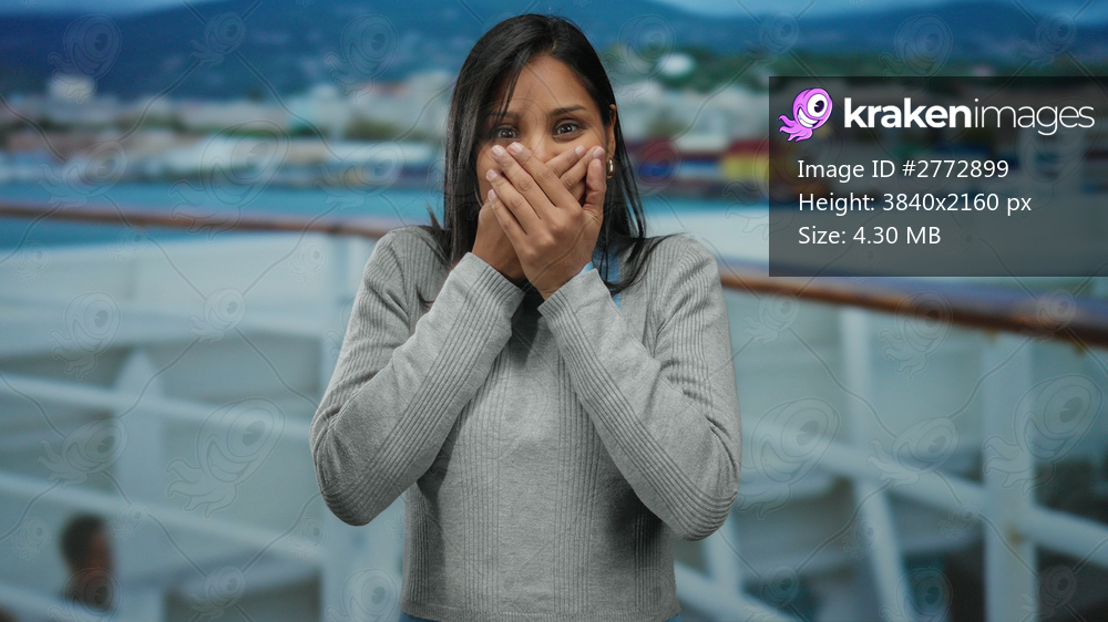 Woman on a cruise covers mouth surprised with vibrant ocean and distant coastline in background, wearing a casual gray sweater and showing a joyful expression on deck. - Kraken Images