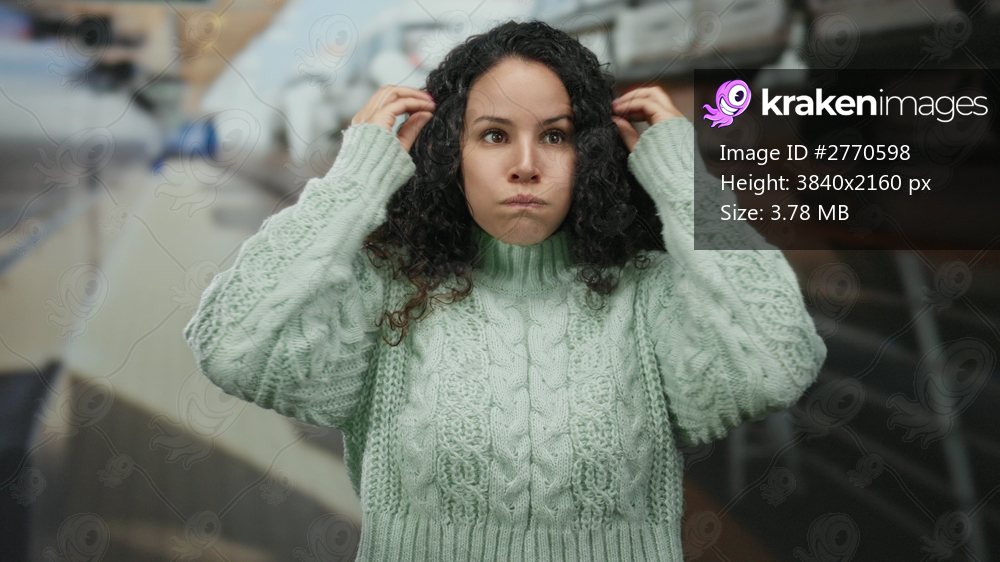 Woman on a cruise ship with wavy hair expresses surprise amid seaside scenery wearing a cozy light sweater under a blue sky suggesting travel and adventure. - Kraken Images