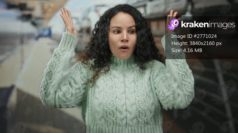 Woman on a cruise ship with wavy hair expresses surprise amid seaside scenery wearing a cozy light sweater under a blue sky suggesting travel and adventure. - Kraken Images