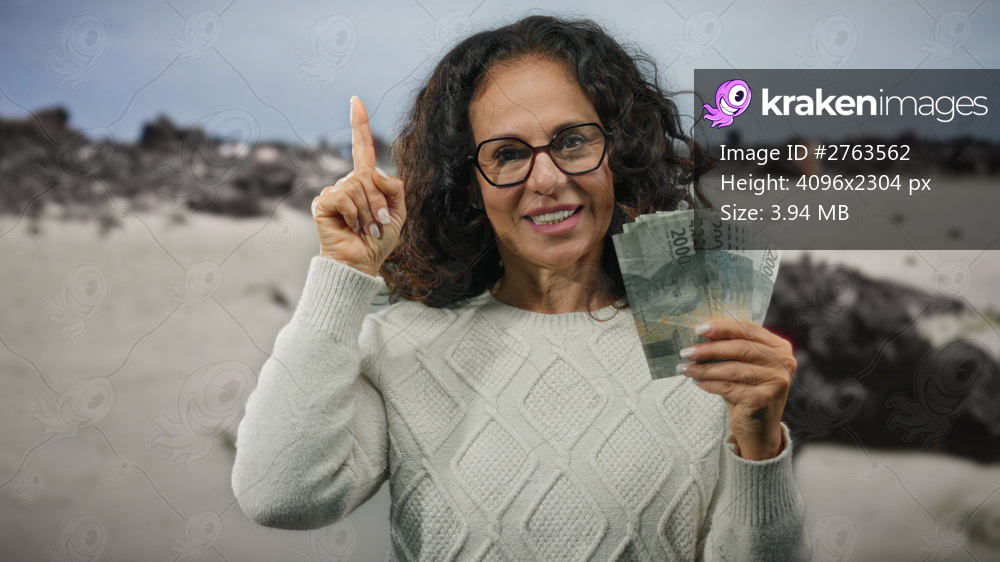 Woman on beach holding indonesian rupiah banknotes while pointing upwards, expressing excitement and confidence by the seaside.