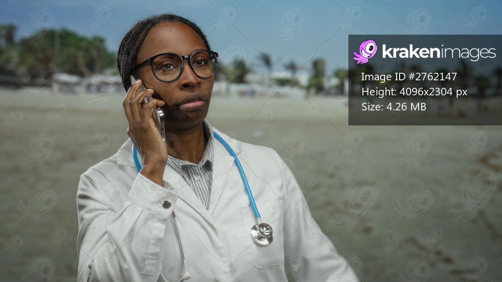 Woman on beach in white coat with smartphone speaks intensely against a seaside backdrop, stethoscope around neck, glasses framing her focused expression, gesturing with one hand. - Kraken Images