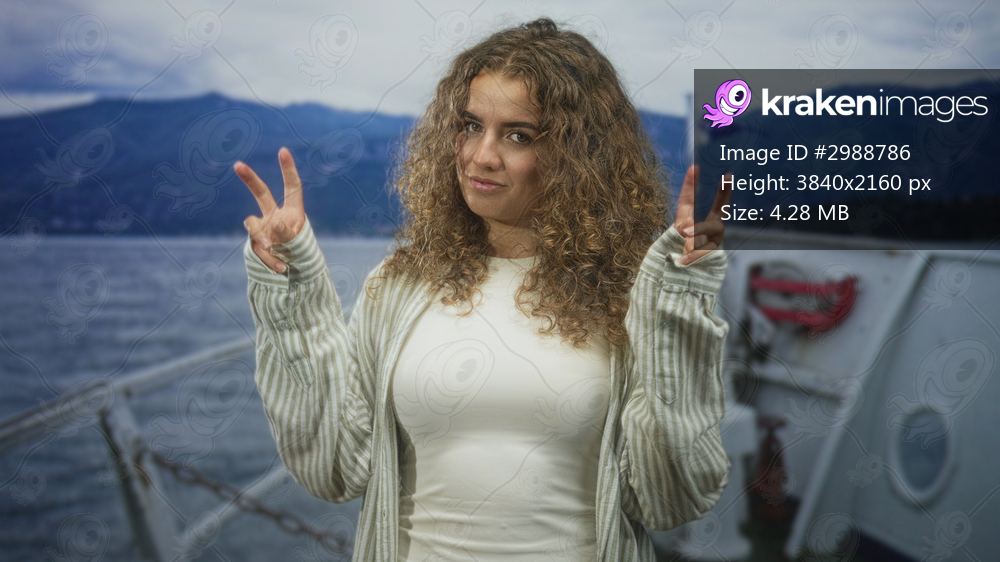 Woman on boat deck making double peace sign with hands, wearing white tshirt and striped sweater near lifebuoy and mountains, studio; playful.