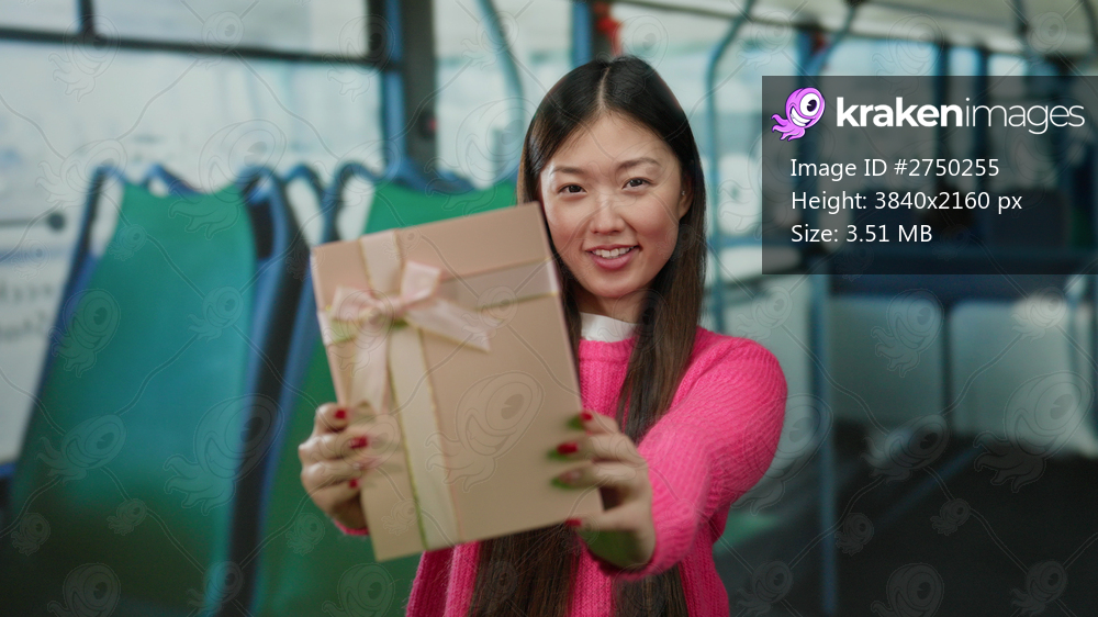 Woman on bus in pink sweater holding gift smiling indoors, showcasing a sense of celebration and joy.