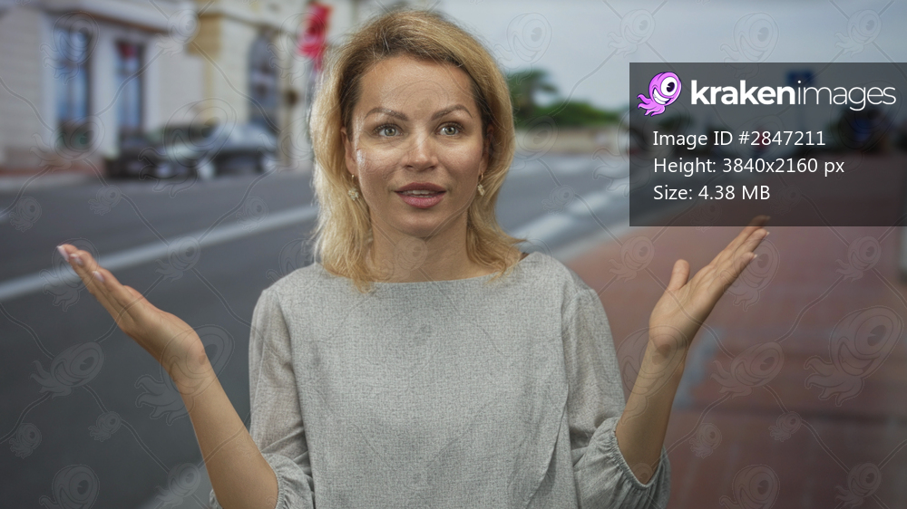 Woman on busy city street spreading open hands on brick sidewalk amid parked cars while wearing grey top; uncertainty.