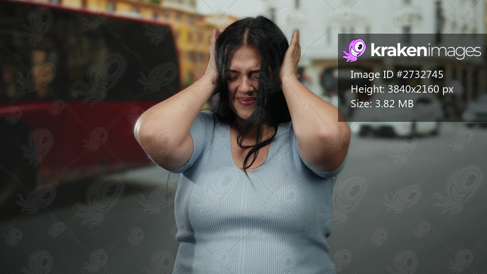 Woman on city street covers ears with hands, expressing frustration as a bus passes by urban background with blurred buildings.
