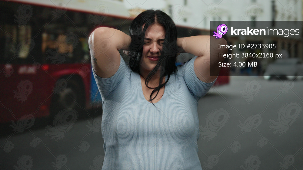 Woman on city street covers ears with hands, expressing frustration as a bus passes by urban background with blurred buildings.
