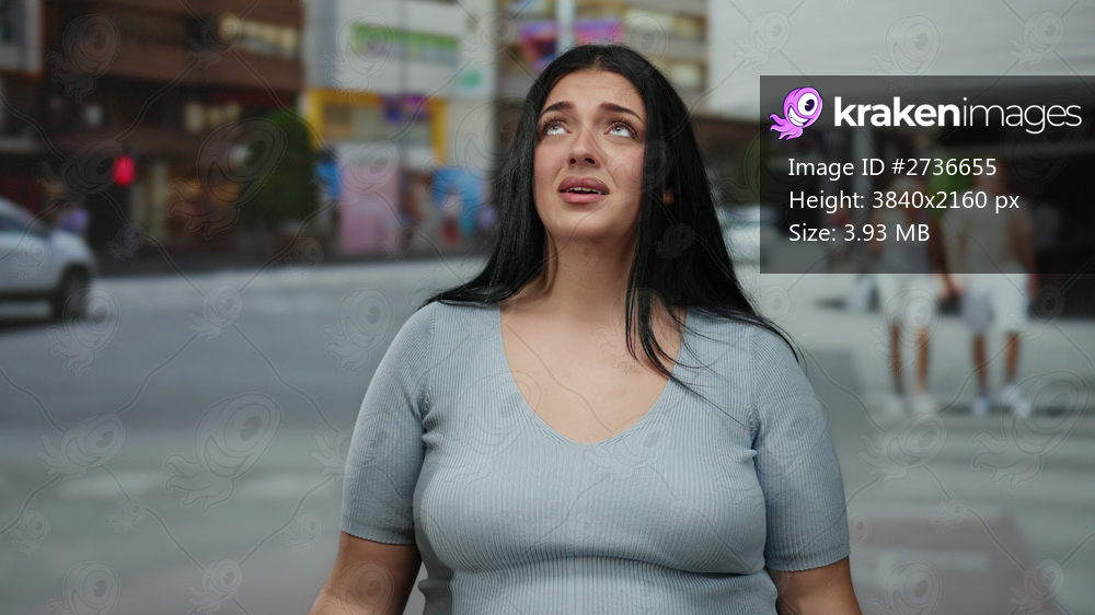 Woman on city street looks worried raising hands in frustration surrounded by urban hustle as pedestrians pass creating a dynamic and relatable urban scene. - Kraken Images