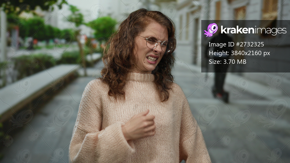 Woman on city street making disgusted expression wearing glasses and sweater in urban outdoor setting showcasing neutral emotions with overcast atmosphere. - Kraken Images