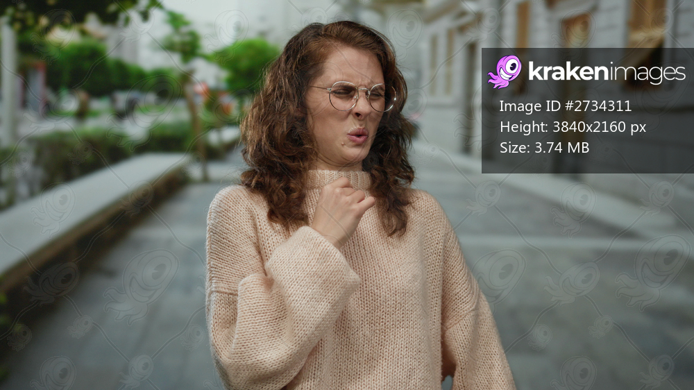 Woman on city street making disgusted expression wearing glasses and sweater in urban outdoor setting showcasing neutral emotions with overcast atmosphere. - Kraken Images