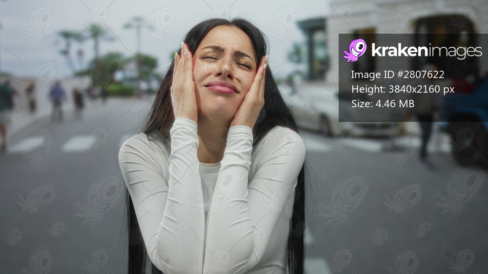 Woman on city street outdoors expressing frustration with hands on her face wearing white sweater showcasing urban lifestyle.