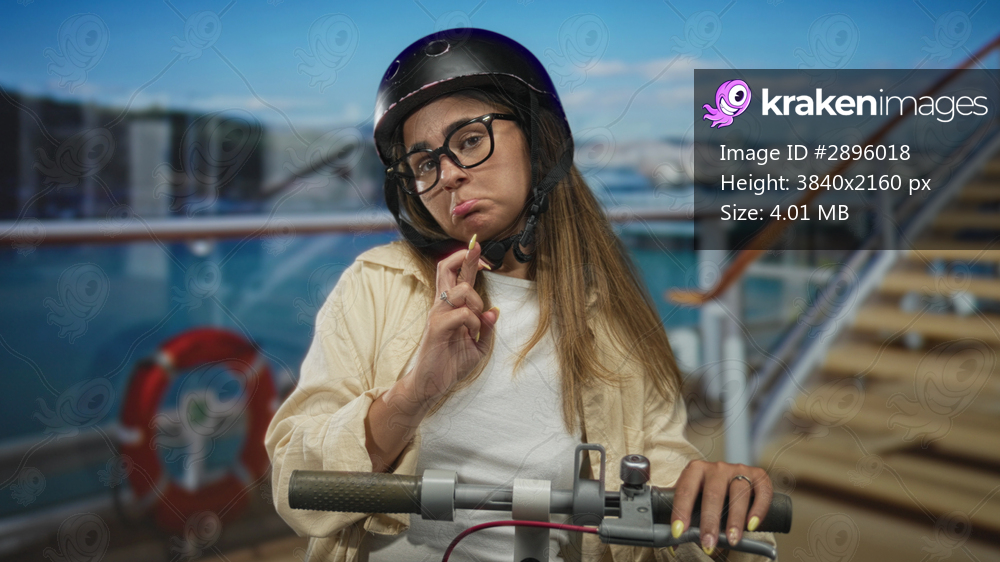Woman on cruise deck holding scooter handlebars with fingers crossed near chin wearing helmet and glasses; hopeful luck.