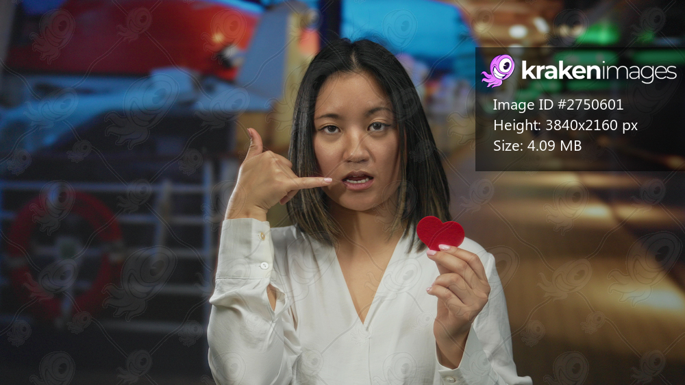 Woman on cruise holding red heart making call me gesture on outdoor deck with seaside view symbolizing love and connection in a relaxed vacation atmosphere - Kraken Images
