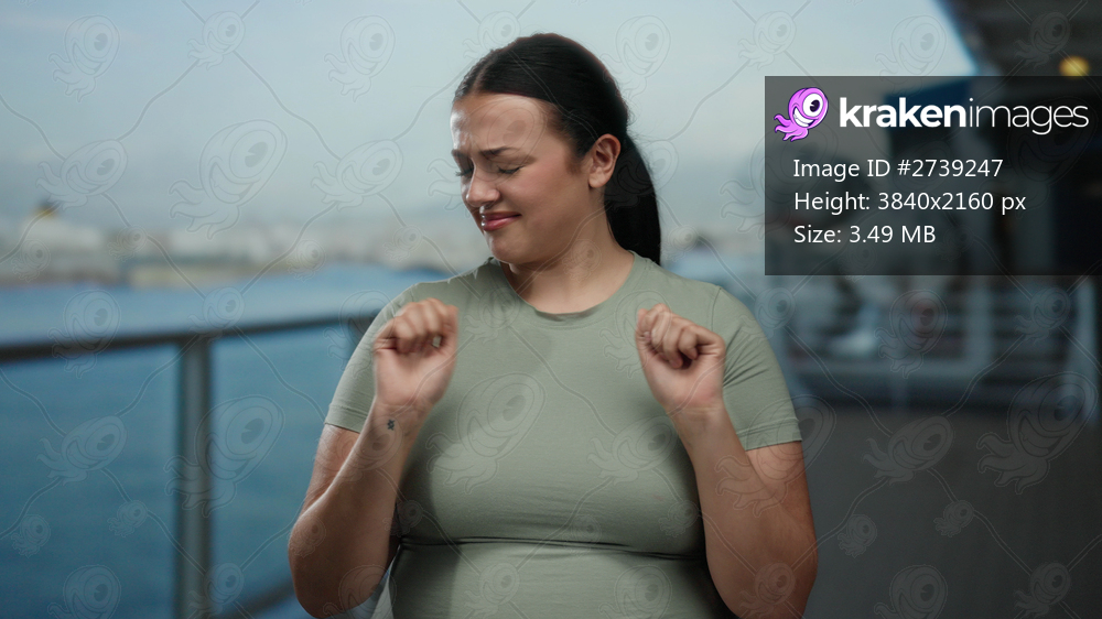 Woman on cruise makes expressive gesture of rejection outdoors amid oceanic backdrop, highlighting emotions in travel setting.