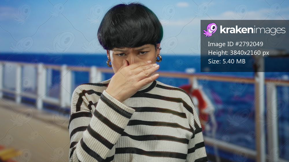 Woman on cruise wearing striped sweater covering nose outdoors on deck with ocean view, evoking an air of discomfort or smell, showcasing stylish asian hair and earrings. - Kraken Images