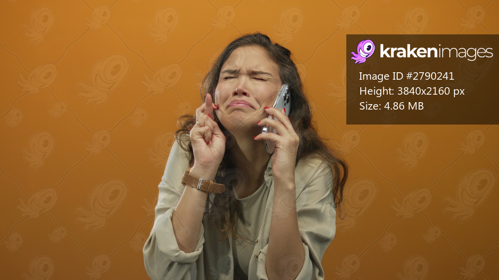 Woman on phone with fingers crossed expressing hope against orange background suggesting anticipation and desire for positive news.