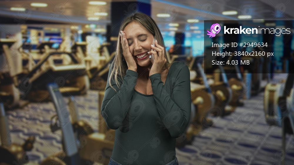 Woman on phone with hands to face, smiling and wide eyed among rows of cardio machines in gym building; surprise.