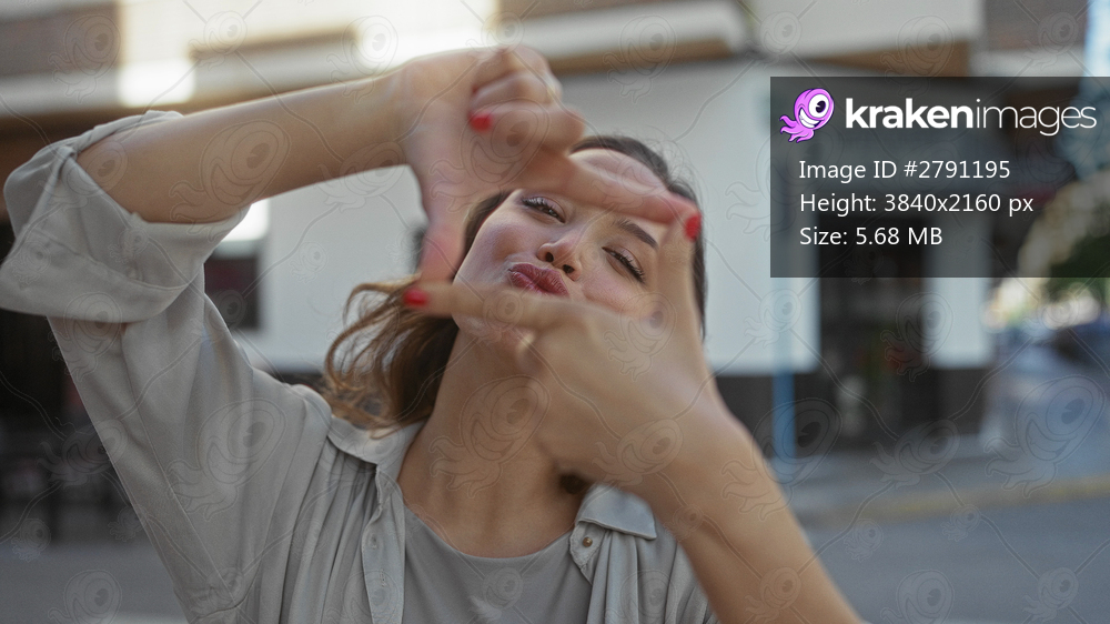 Woman on street frames face with fingers in playful gesture, capturing candid joyful moment in vibrant urban setting, showcasing youthful energy and expressive emotion outdoors. - Kraken Images