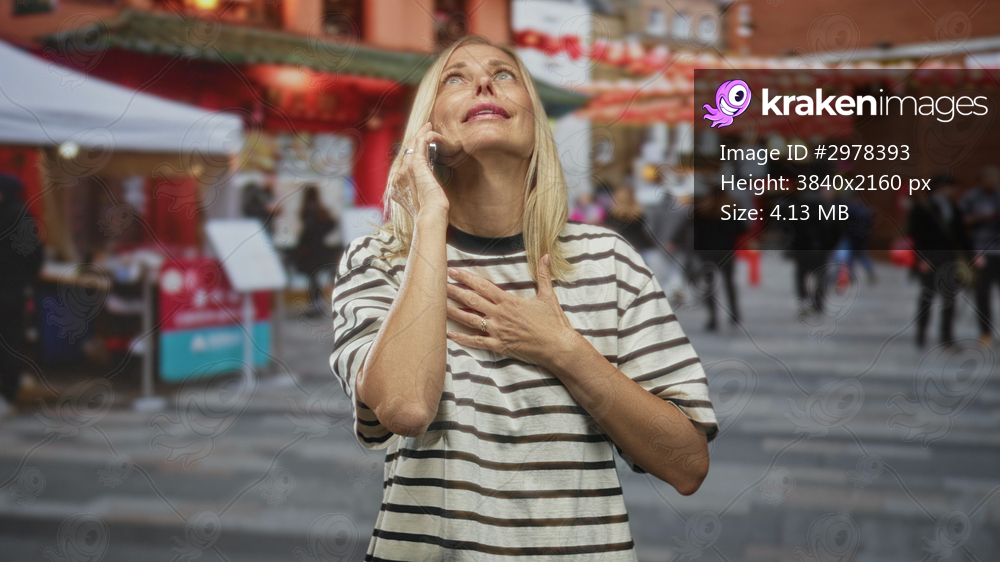 Woman on street holds phone to ear and clutches chest as if heartattack near outdoor market stalls and lanterns; urgent help distress.