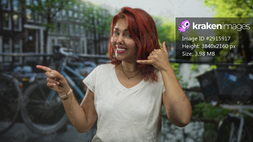 Woman on street in amsterdam points finger with left hand and makes call gesture with right hand, smiling and wearing white tee and necklaces; playful confidence. - Kraken Images