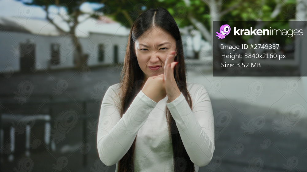Woman on urban street appearing thoughtful in a cityscape; young female expressing with her fists in an outdoor setting.