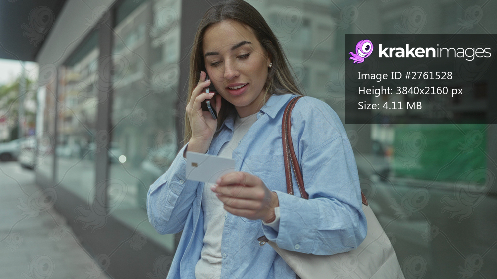 Woman on urban street talking on phone, wearing blue shirt, holding card, outdoors, daytime, looking focused, carrying bag, standing near building reflection. - Kraken Images